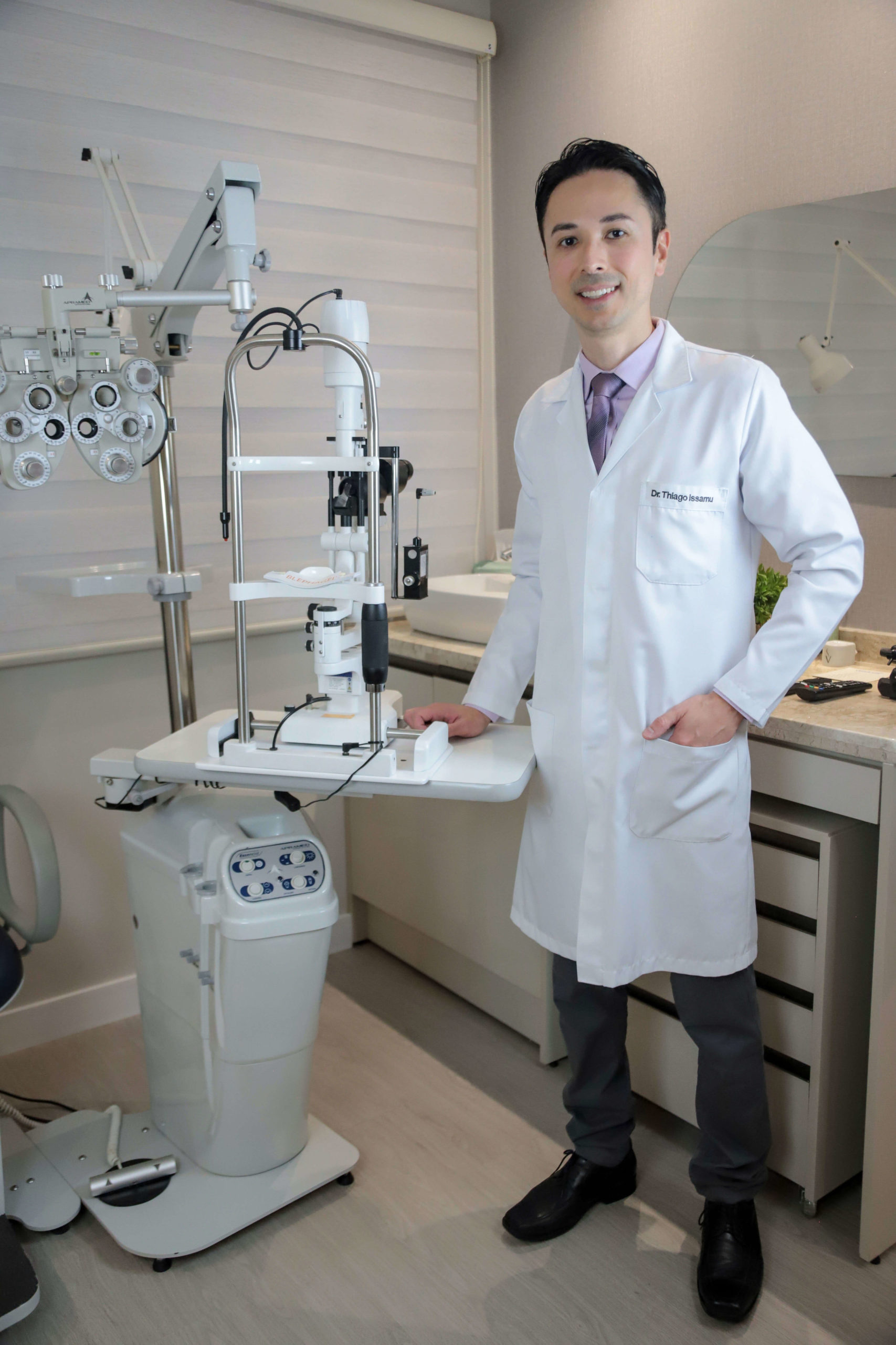 Dr. Thiago Issamu, um Médico Oftalmologista, destacando sua formação acadêmica, experiência clínica e conquistas ao longo de sua carreira.